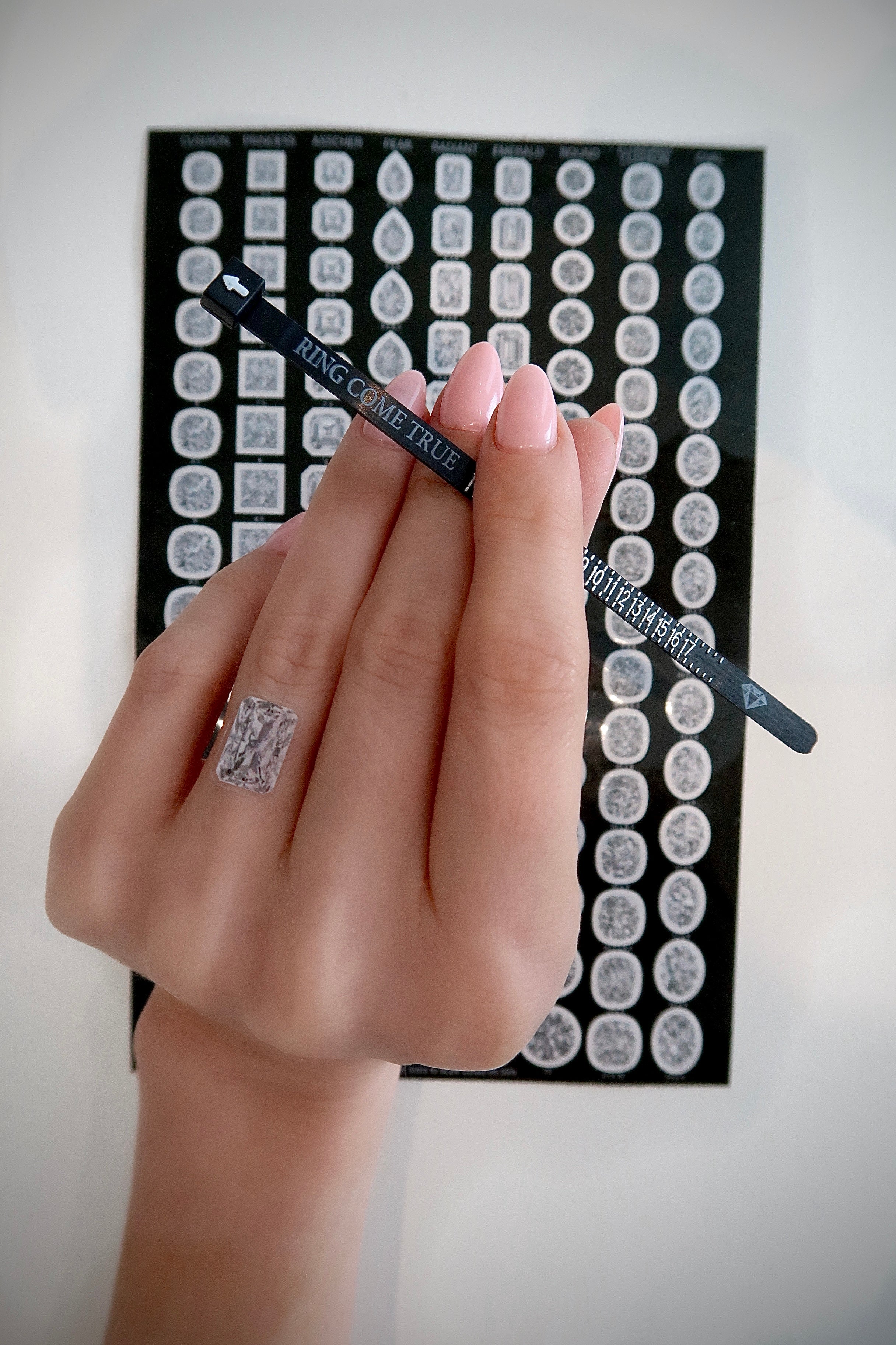Try on different stone sizes and shapes from the comfort of your home! Peel and stick the gems to the desired finger, they are to scale! For the sizer, just wrap it around your finger and adjust until you get a comfortable fit. You want it to be snug on the area where the ring will sit while still being able to slide it on and off the entire finger. A little resistance getting it off is ok!